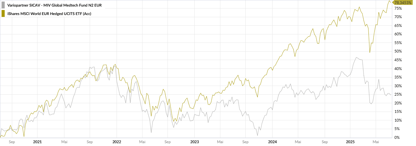 Also, womöglich gute Einstiegskurse. Doch wie investiert man als Fondsmanager in Med-Tech? Da wird es schon etwas heikel. Gerade einmal hundert Titel stehen zur Auswahl, die für seinen MIV Global Medtech Fund investierbar sind, sagt Gubler. 38 Titel hält der Fonds. Die Branche besteht zu 50 Prozent aus US-Firmen und 80 Prozent notiert in US-Dollar, was 2025 auch nicht gerade ein Kurstreiber war.